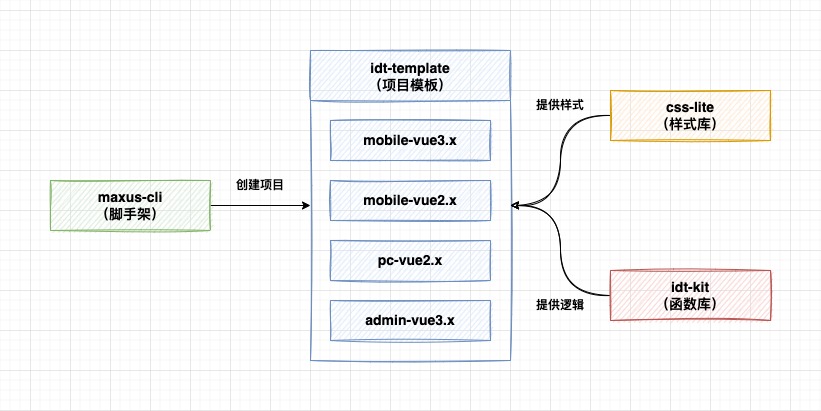 企业运营的前端工具链由多个平台项目构成,它们之间的关系如下图所示: